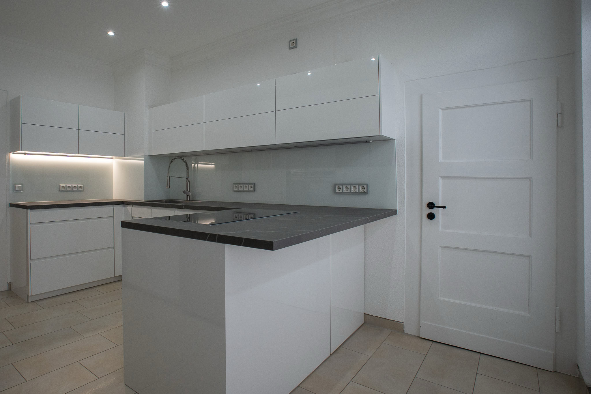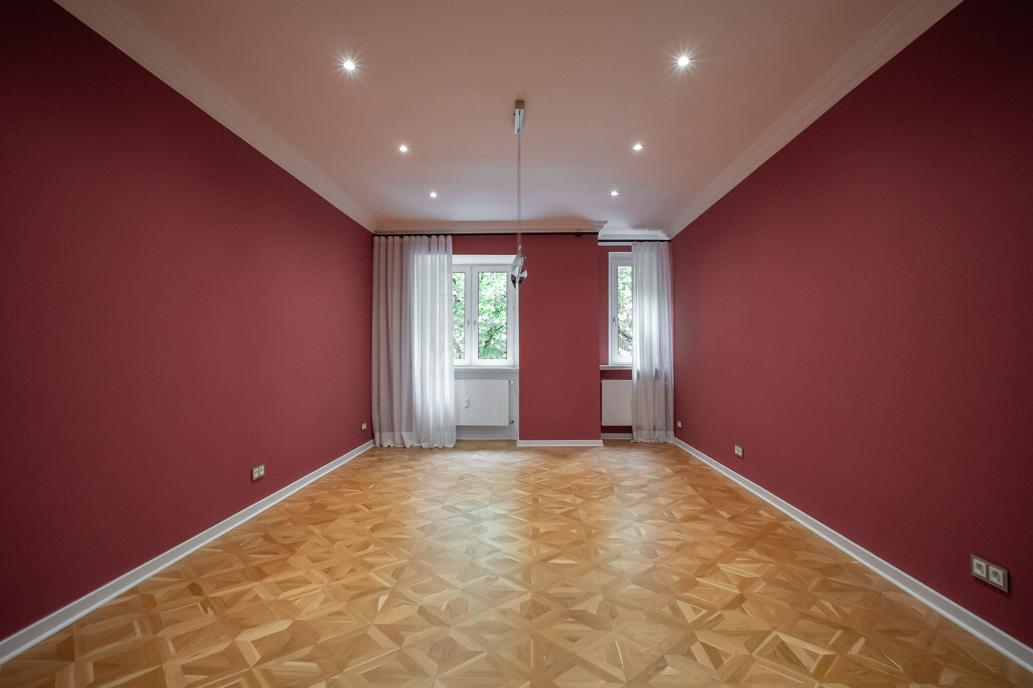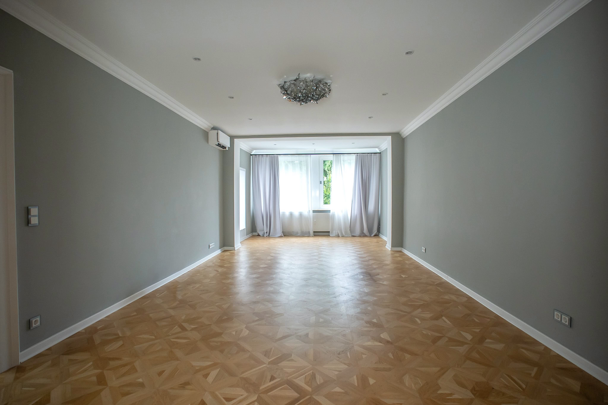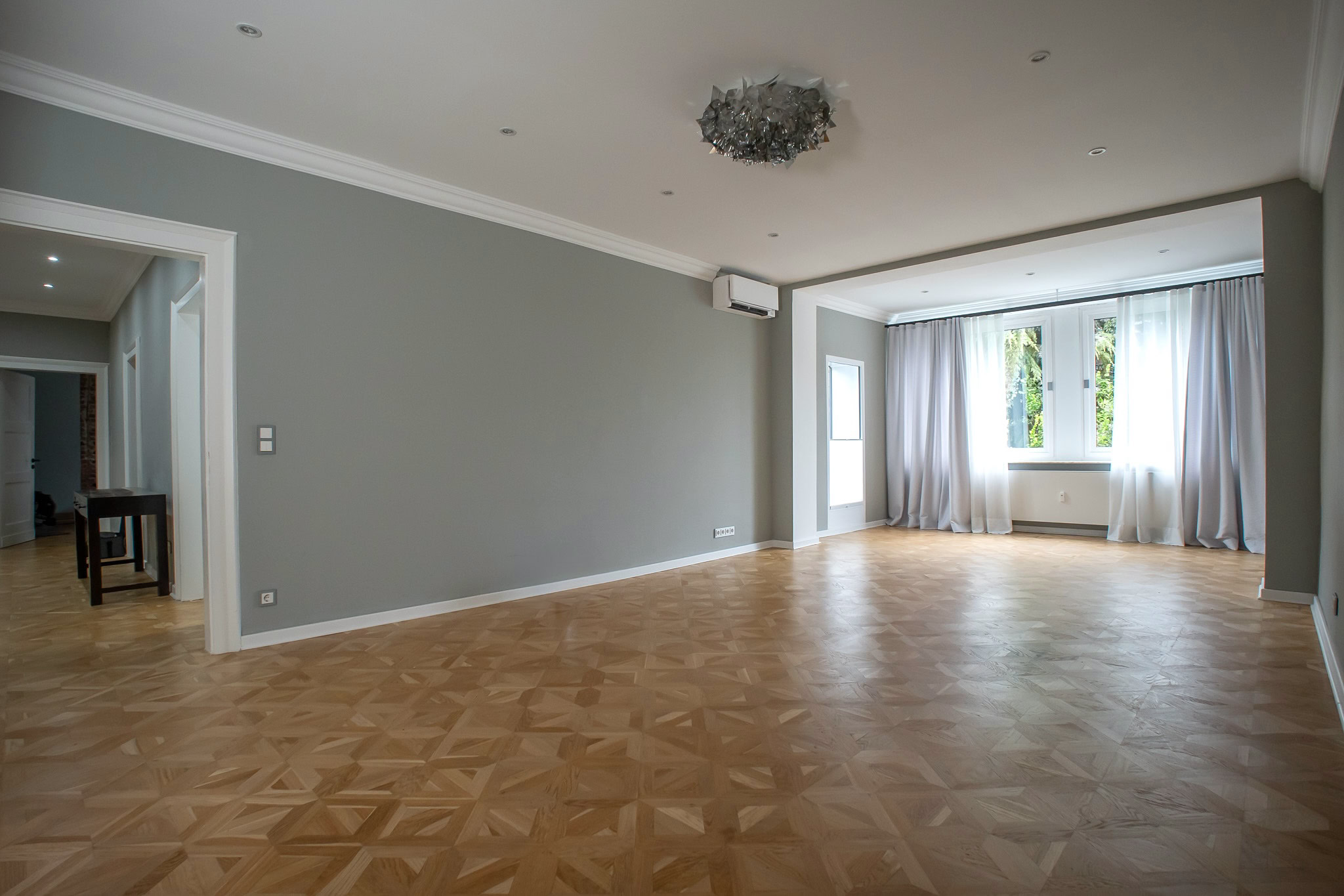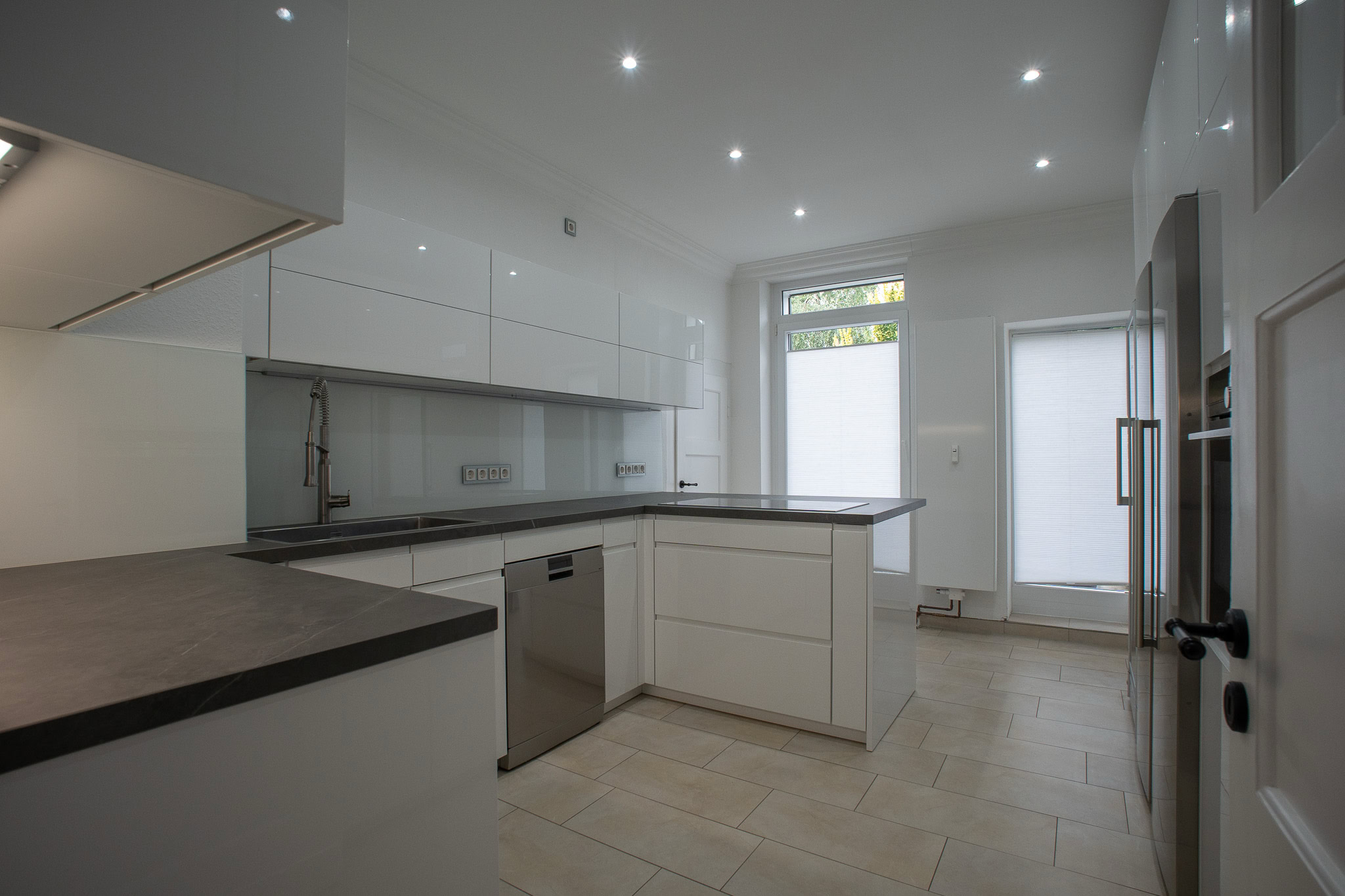 Die Böden der Wohnung sind mit Echtholzparkett und stilvollen Fliesen ausgelegt, die eine hochwertige und wohlige Wohnatmosphäre schaffen. Große Fensterfronten, zum Teil mit maßgefertigten und stilvollen Vorhängen, sorgen für Helligkeit. Alle Decken in der Wohnung wurden gedämmt und mit Einbaustrahlern ausgestattet, die für optimale Lichtverhältnisse sorgen.