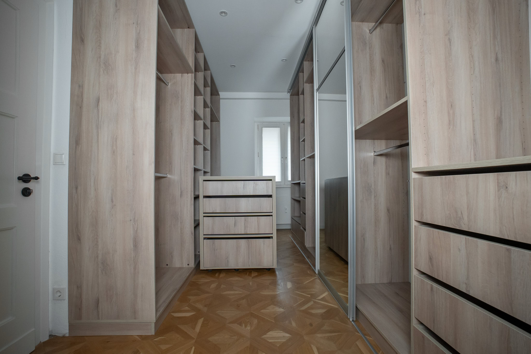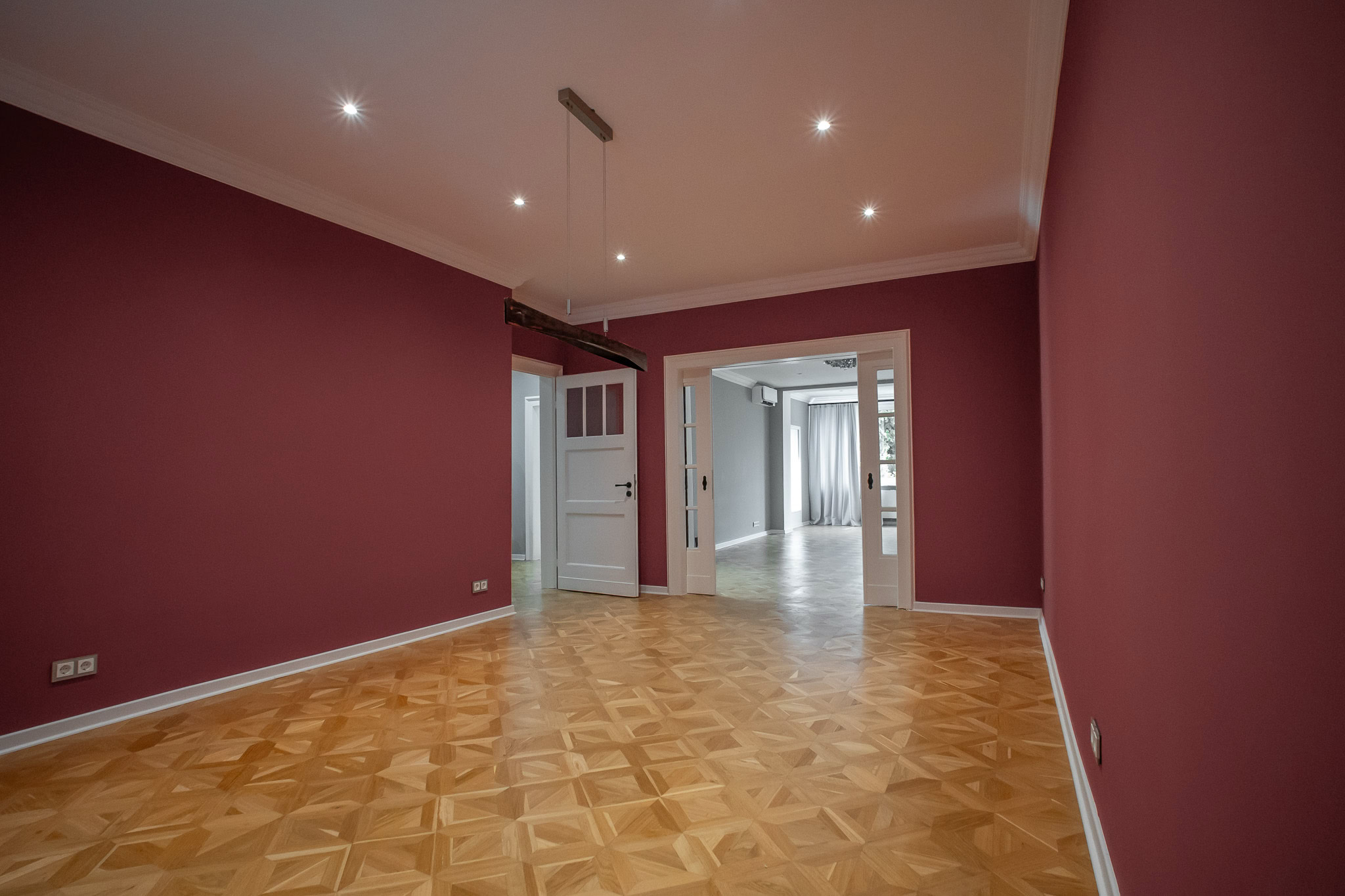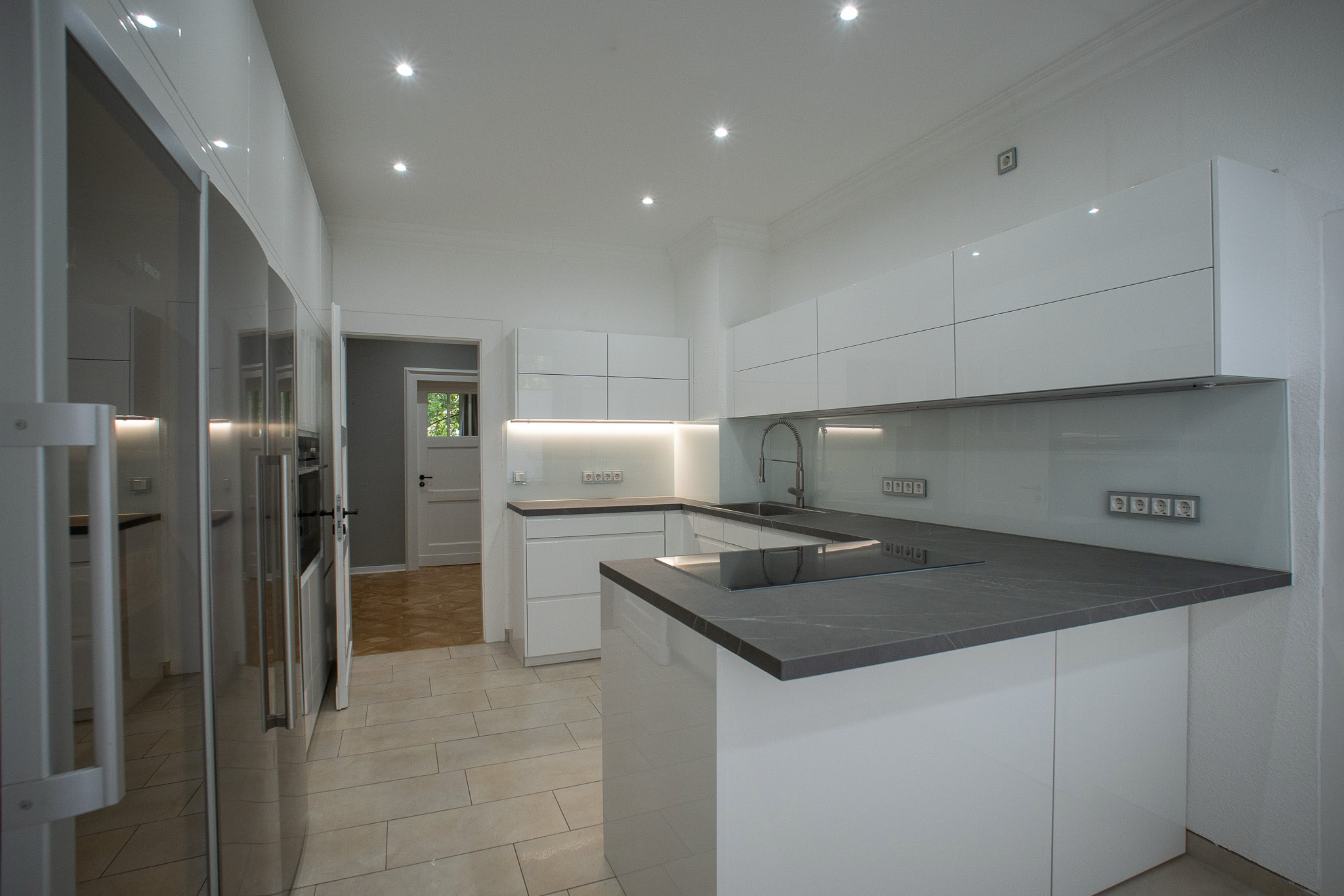 Das Herzstück der Wohnung ist der große Wohn- und Essbereich, der auf Wunsch durch eine historische Schiebetür getrennt werden kann. Die hochwertige Küche entspricht den neuesten Standards und verfügt über einen zusätzlichen Weinkühlschrank, einen Backofen mit Mikrowelle und einen weiteren Backofen sowie viele innovative Funktionen. Der direkt an die Küche angrenzende Abstellraum bietet Platz für Waschmaschine, Trockner und Vorräte.
