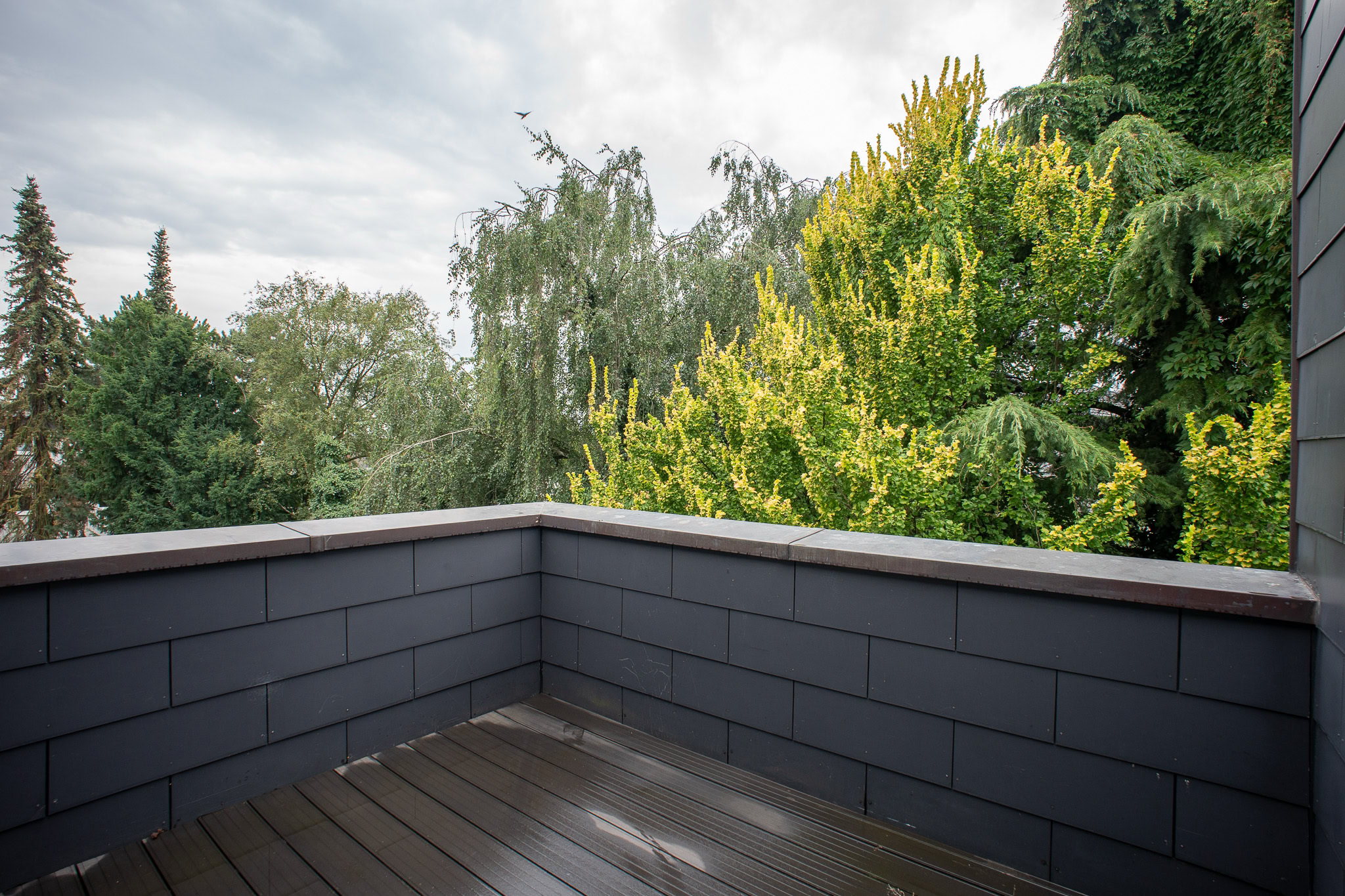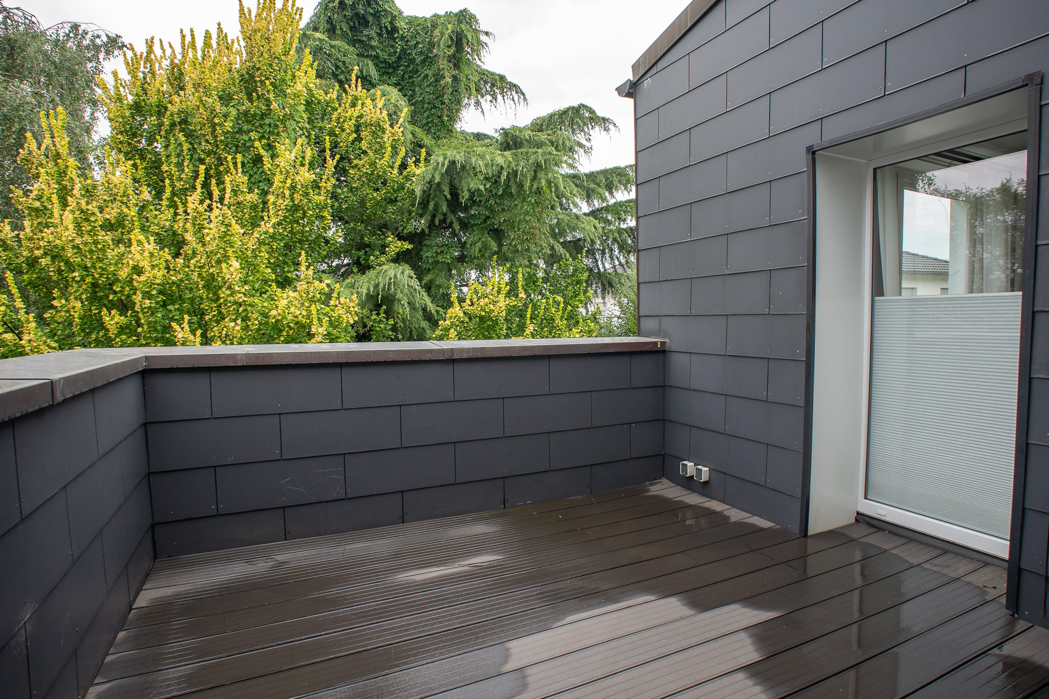 Weiterhin gelangt man von der Küche aus zu einem Balkon, der zum Essen im Freien einlädt. Dieser ist nicht einsehbar und der Blick ins Grüne macht ihn besonders attraktiv. Das Schlafzimmer im Industrial-Stil verfügt über ein eigenes Tageslicht-Badezimmer en Suite, das Ihnen Privatsphäre und Komfort bietet. Zusätzlich steht ein Gäste-WC zur Verfügung. Vom Schlafzimmer und Flur aus gelangen Sie direkt zum begehbaren Kleiderschrank.