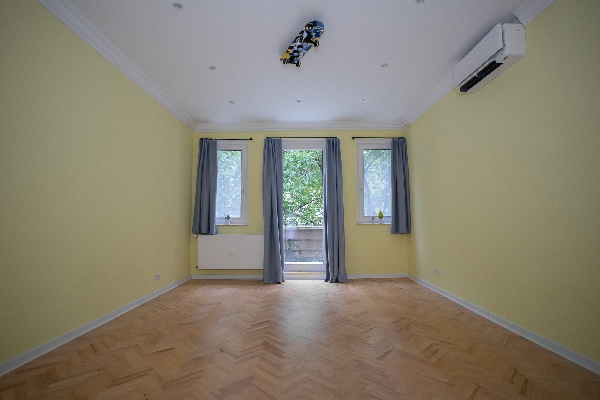 Das ebenfalls großzügig geschnittene Kinderzimmer mit Balkon bietet die Möglichkeit, frische Luft hereinzulassen und das Treiben auf der Straße zu beobachten. Das Wohnzimmer, Schlafzimmer sowie das Kinderzimmer sind mit einer Klimaanlage ausgestattet, die für ein angenehmes Raumklima in allen Räumen sorgt. Das ausbaufähige Dachgeschoss ist bereits für ein weiteres Klimagerät vorbereitet.