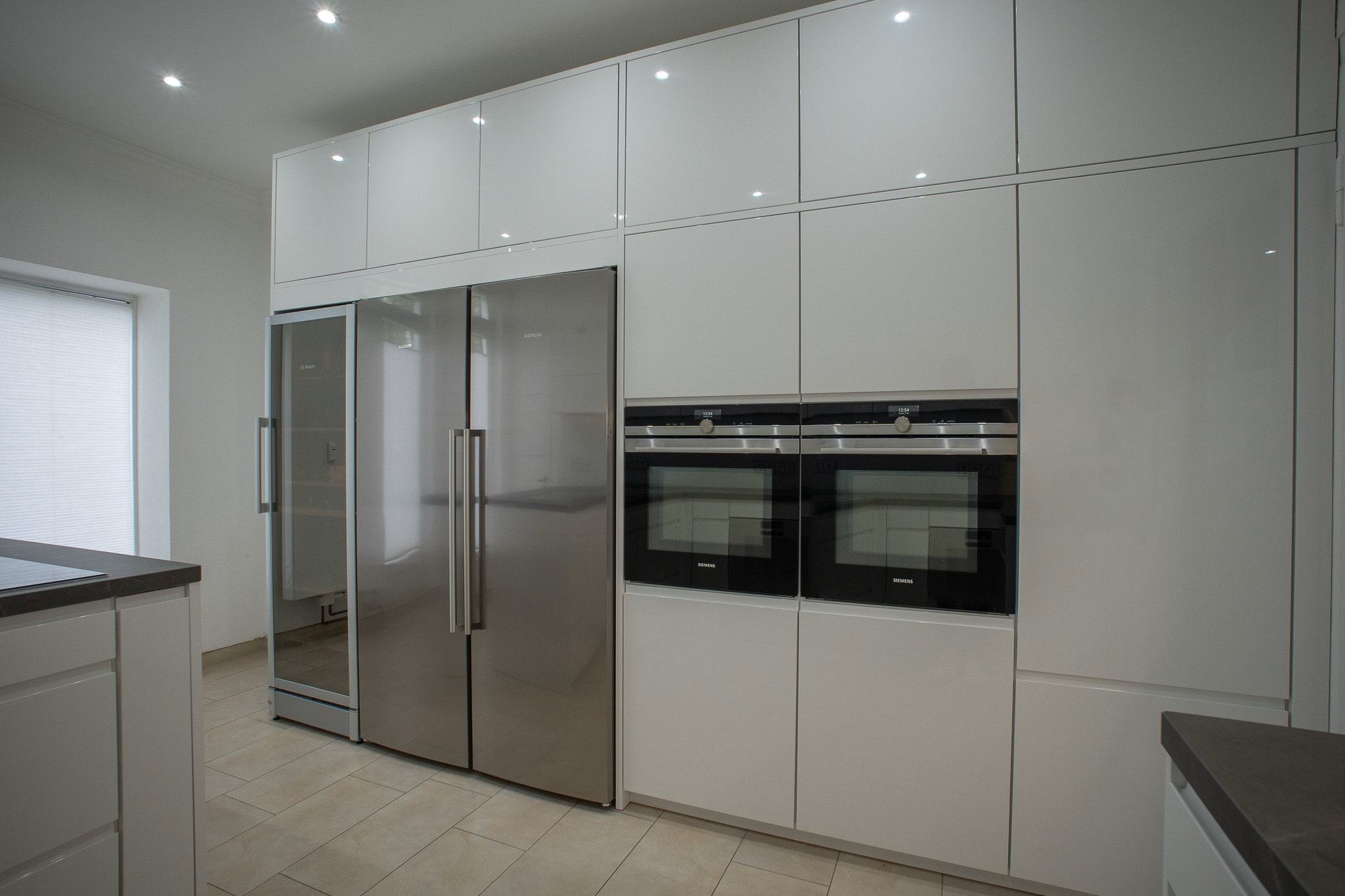 Das Herzstück der Wohnung ist der große Wohn- und Essbereich, der auf Wunsch durch eine historische Schiebetür getrennt werden kann. Die hochwertige Küche entspricht den neuesten Standards und verfügt über einen zusätzlichen Weinkühlschrank, einen Backofen mit Mikrowelle und einen weiteren Backofen sowie viele innovative Funktionen. Der direkt an die Küche angrenzende Abstellraum bietet Platz für Waschmaschine, Trockner und Vorräte.